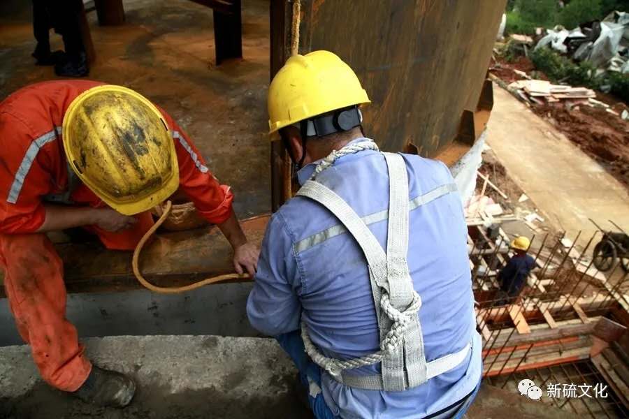 地面上大吊车、大货车,选矿厂相关负责人、技术人员、安全员等忙着起吊庞然大物时,“焊高组”在底座上也一刻没闲着,拖运电焊设备、准备焊接材料、在底座上铺水泥保持平面,各个槽体支脚找平衡......由于底座紧挨着磨浮车间,空气不流通,加上天气闷热难挡,武装整齐的好“焊”们一会就汗湿了工作服,汗珠顺着安全帽压着的发根往下滚。